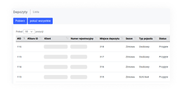 Możesz pobrać listę opon, dzięki czemu masz pełny wgląd w stan przechowalni. Ułatwi Ci to pracę podczas sezonowych wymian. Szybciej sprawdzisz jakie opony są dostępne, ich rozmiary, stan techniczny oraz ilość.